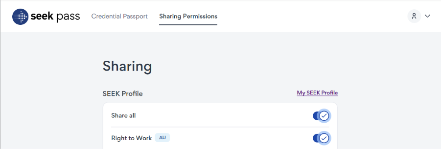 To stop sharing any of your verified credentials with our partners, go to the Sharing Permissions tab at the top of your SEEK Pass profile and toggle off the credential you no longer wish to share.